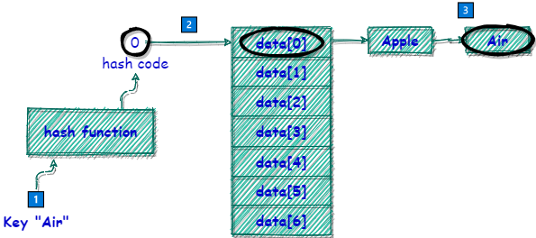 2️⃣ 해시함수의 계산결과(해시코드)로 해당 값이 저장되어 있는 링크드 리스트를 찾는다.