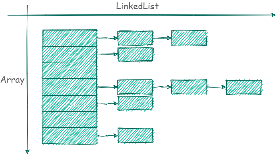해싱에서 사용하는 자료구조는 배열과 LinkedList의 자료구조의 조합으로 되어있다.