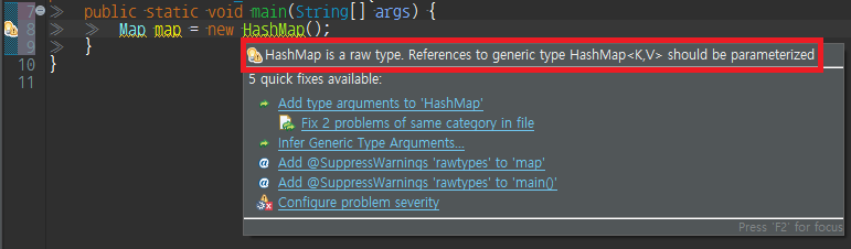 위의 경고는 Map에 제네릭스에 타입 매개변수를 지정해주지 않아 생기는 경고다