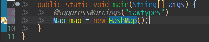 경우에 따라 경고가 발생해도 묵인해야 할 때가 있는데 이럴때 사용 된다.@SuppressWarnings는 위와 같은 경고들을 보이지 않게 해준다.