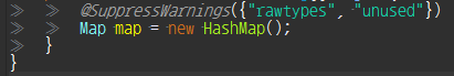 경우에 따라 경고가 발생해도 묵인해야 할 때가 있는데 이럴때 사용 된다.@SuppressWarnings는 위와 같은 경고들을 보이지 않게 해준다.