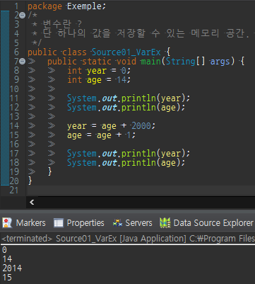 int age = 25; // 변수 age를 선언하고 25로 초기화한다.