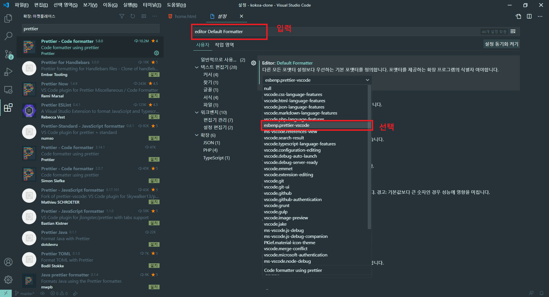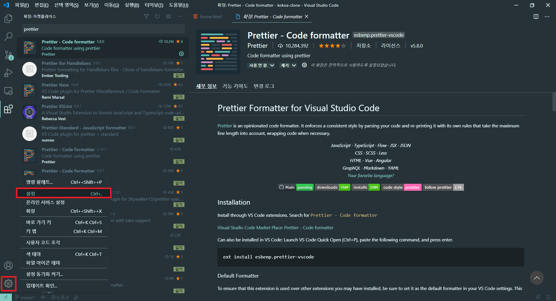2. 검색창에 prettier를 입력후 검색된 prettier를 설치하자.
