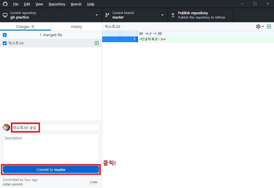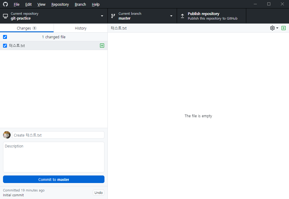 제목에는 테스트.txt 생성 을 적어주었고 설명은 필수가 아니기 때문에 작성하지 않았다.
