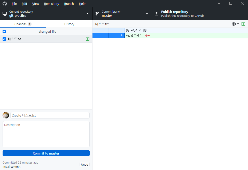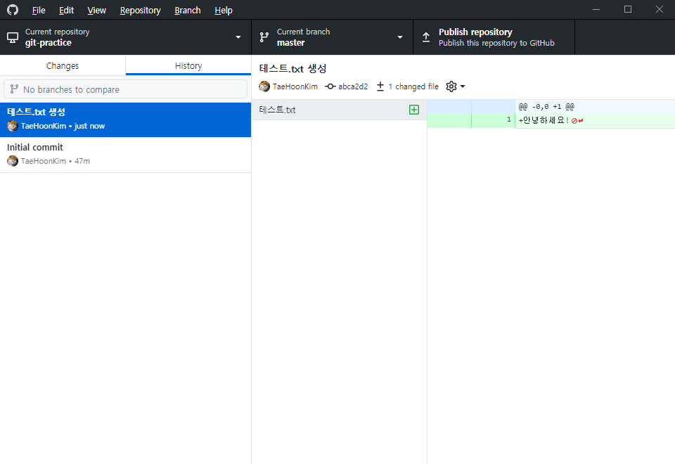GitHubDeskTop이 테스트.txt에서 변경된 내용이 무엇인지 트랙킹하여 알려준다