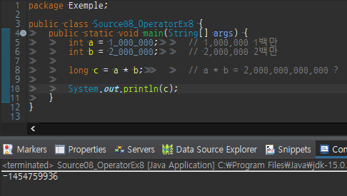 식 a * b의 결과 값을 담을 변수 c가 long(8byte)타입 이기 때문에 "2,000,000,000,000"을 담기에 충분해 보이지만