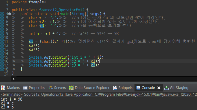 c3 = (char)(c1 +1); → c3 = (char)(97 + 1) >> 98의 값을 char로 형변환 하여 c3에 문자 'b(98)'가 대입됨