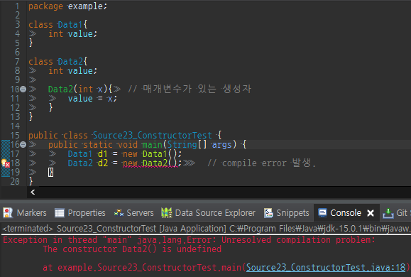 Data2의 경우는 이미 생성자가 존재하기 때문에 기본 생성자가 만들어지지 않기 때문에