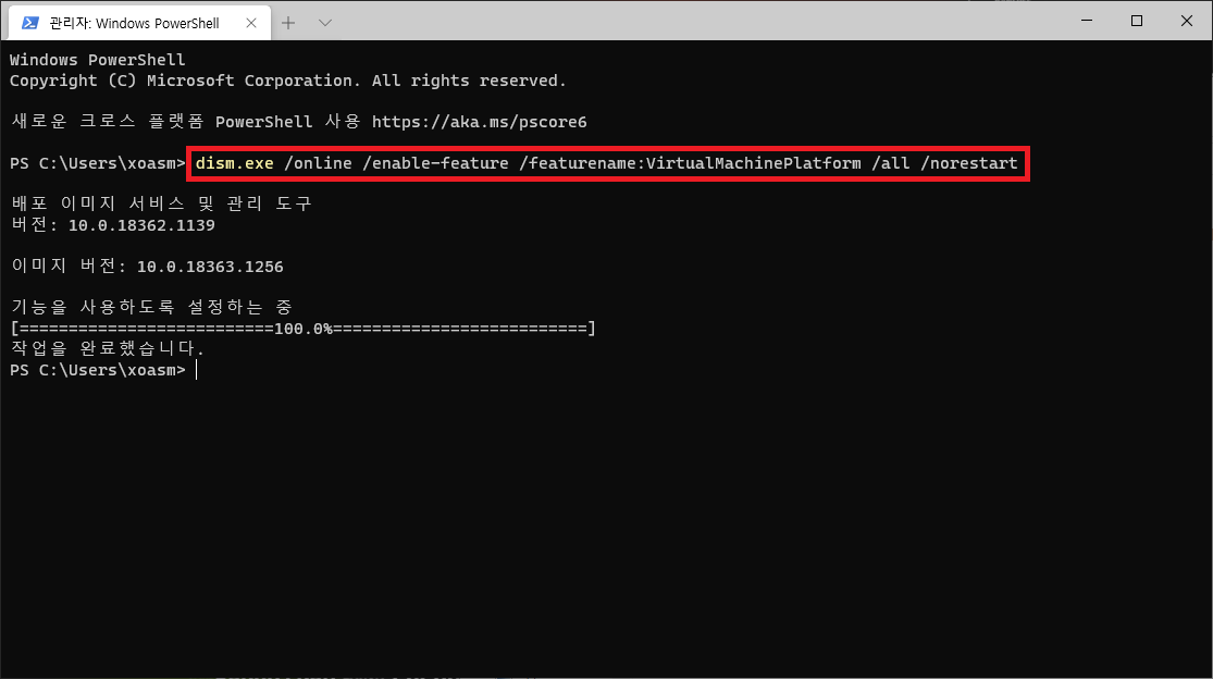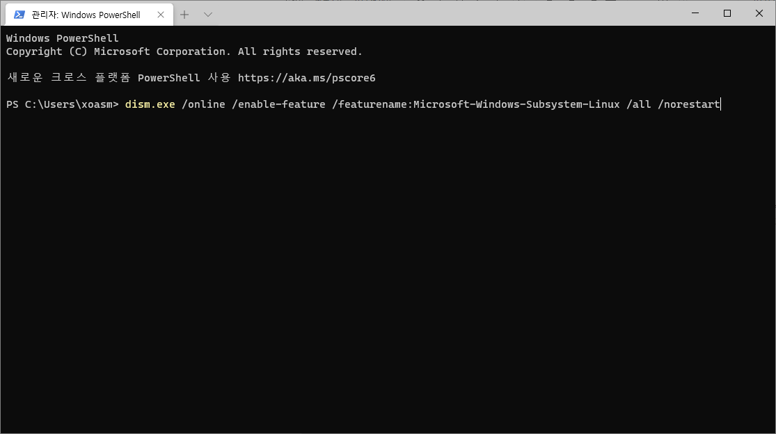 8. powerShell를 관리자권한으로 실행 후 복사한 문자열 붙여넣기 엔터! 설치가 완료되면 컴퓨터를 다시 시작해준다.