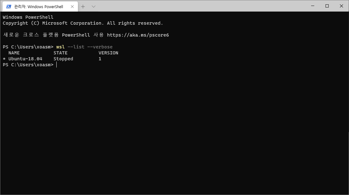 관리자권한으로 켜진 PowerShell에 wsl --list --verbose를 입력해준다.