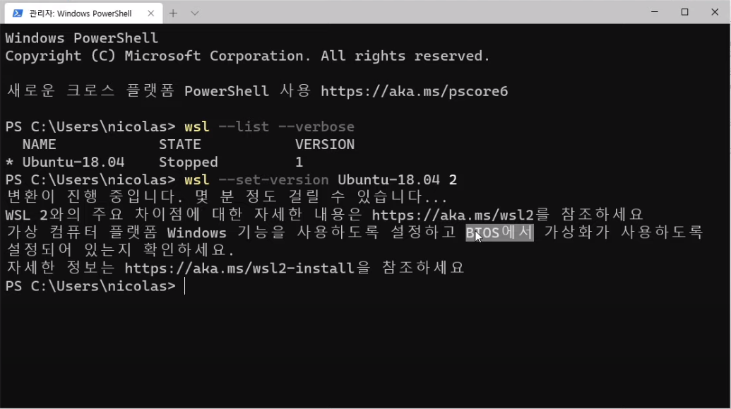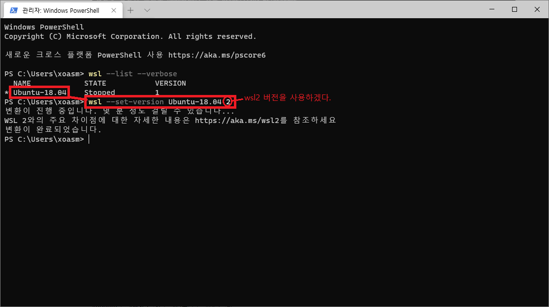 wsl --set-version (알아낸 이름) (사용할 버전)을 적어준다
