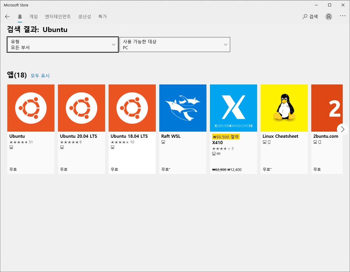 3. 마이크로소프트 스토어에서 Ubuntu를 설치해준다. 나는 18.04버전을 선택했다 설치가 끝나면 재부팅 한번 해주자