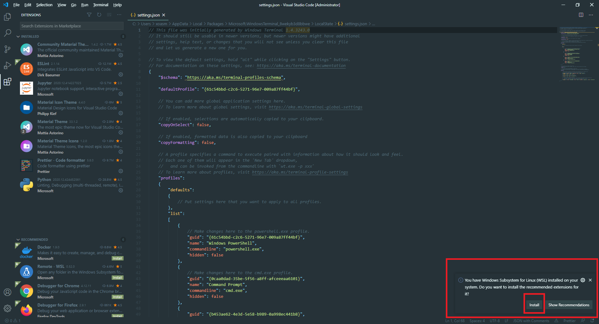 아래의 캡처는 우분투의 guid를 복사해서 defaultProfile에 붙여 넣었다 이제