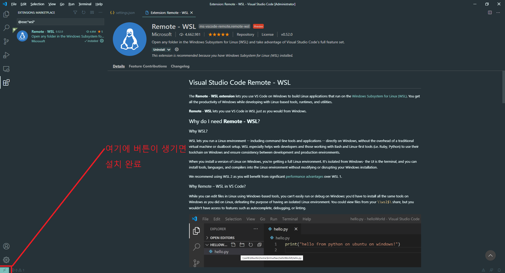 2. install 할 거냐고 물어보는데 인스톨 하자. WSL을 Visual Studio Code(VS Code)에서 사용할 수 있도록