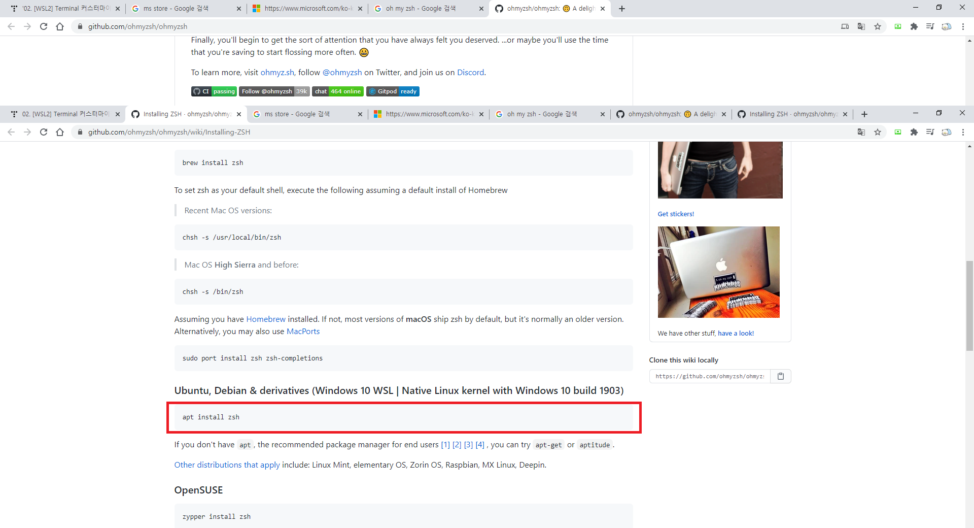 WSL Ubuntu에 대한 설명이 나와있다 그냥 apt intstall zsh를 콘솔에 치라고 나와있다.