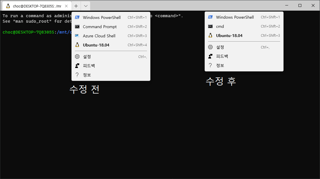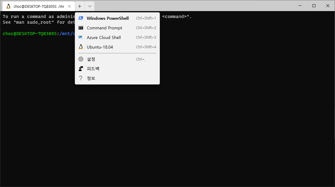 조금 읽어보면 가장 위에서부터 PowerShell, Command Prompt, Azura Cloud Shell, Ubuntu 인걸 알 수 있다.