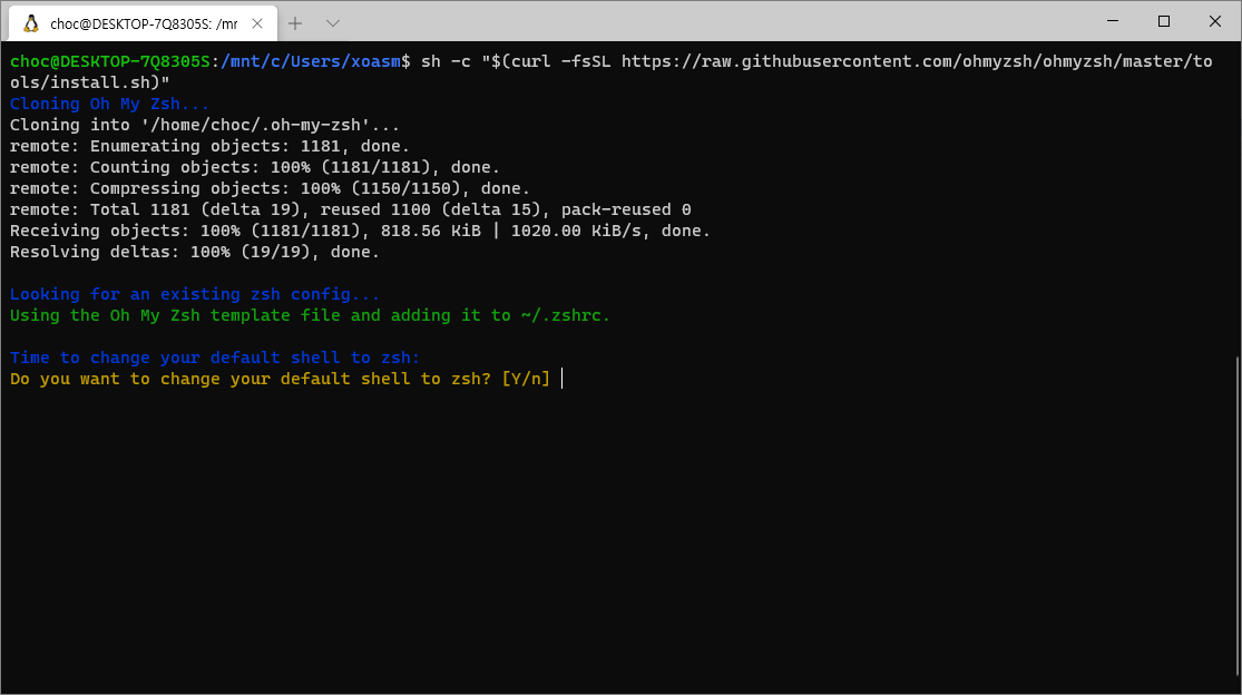 12. 이번엔 sudo를 안 넣어도 된다. 실행이 되면 중간에 디폴트 쉘을 zsh로 바꾸겠냐고 물어보는데 y를 선택하면