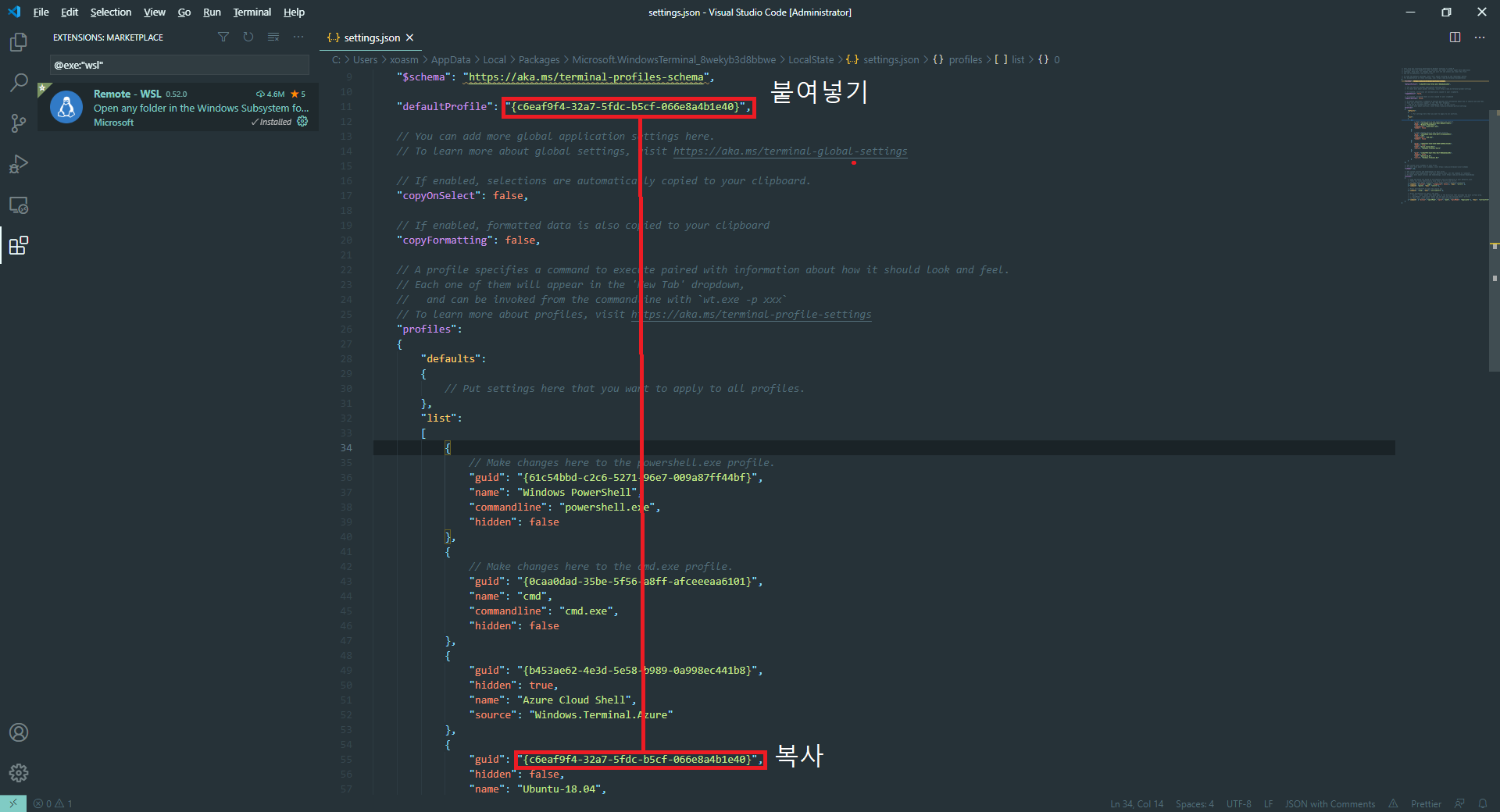 아래의 캡처는 우분투의 guid를 복사해서 defaultProfile에 붙여 넣었다 이제