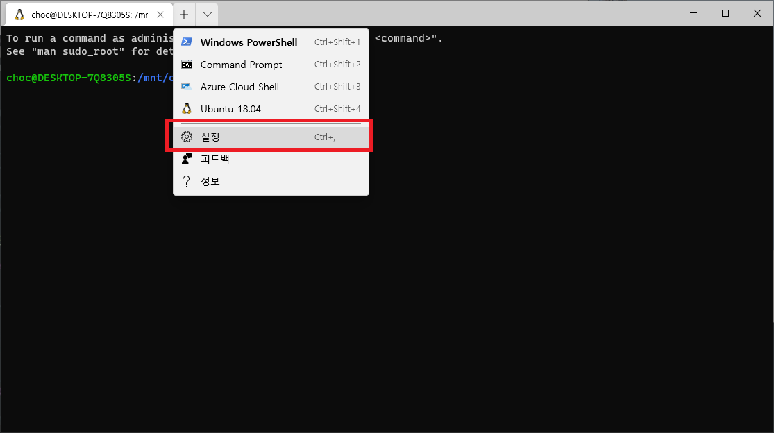 조금 읽어보면 가장 위에서부터 PowerShell, Command Prompt, Azura Cloud Shell, Ubuntu 인걸 알 수 있다.