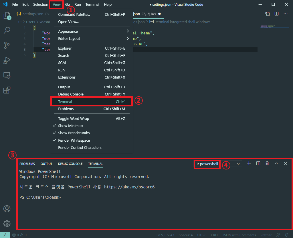 1. 캡처에 써 잇는 순서대로 View → Terminal 클릭 → Terminal창 호출 →Powershell인걸 볼 수 있다.