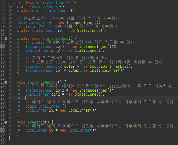 간주되고, 인스턴스멤버와 static멤버 간의 규칙이 내부 클레스에도 똑같이 적용된다.