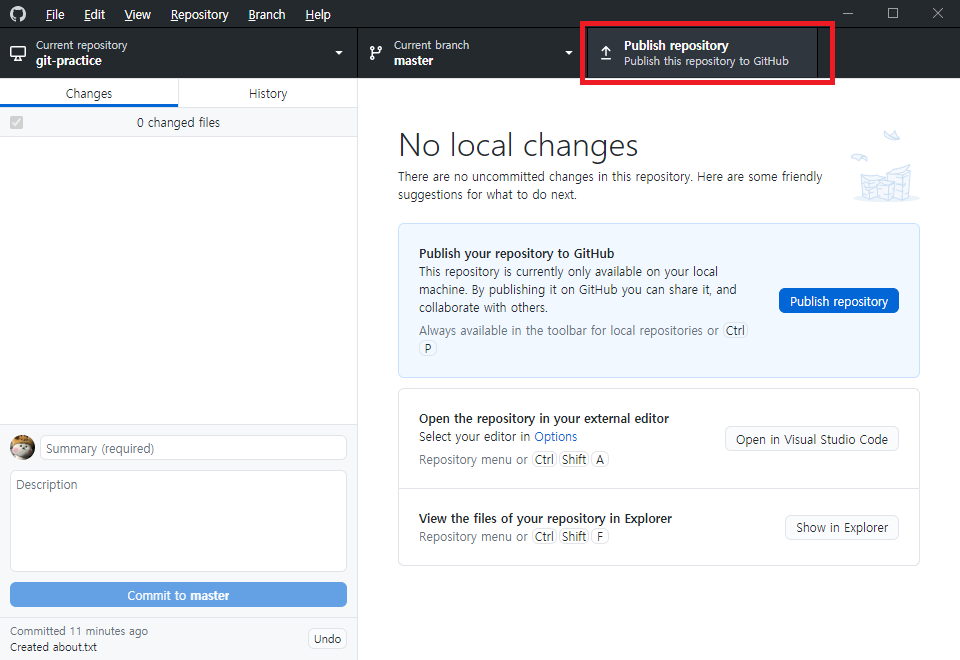 깃허브 저장소에 올리고 싶다면 퍼블리쉬 레포지터리 버튼을 클릭하면 된다.