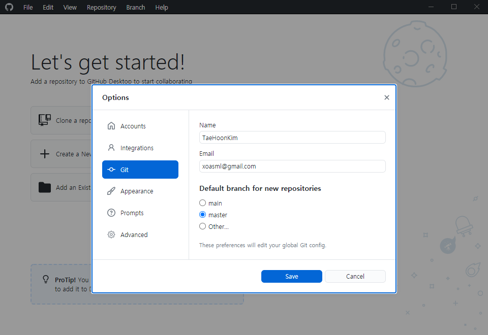 Name과 Email을 깃허브 아이디에 작성한 것과 똑같이 작성하는 것이 좋다.