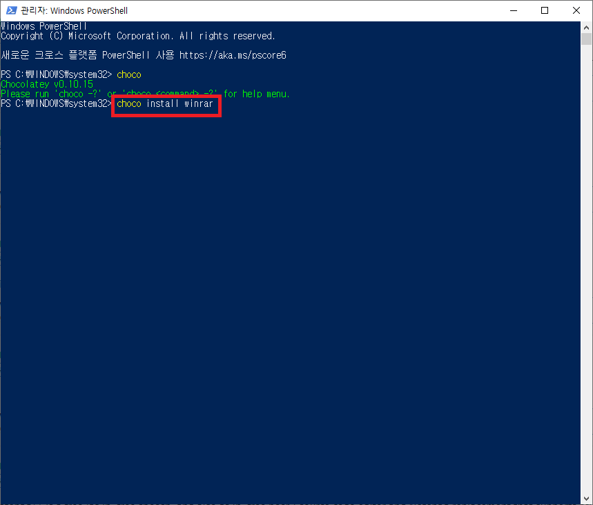 7. Chocolatey가 설치되었는 지 확인하기 위해 PowerShell을 껏다 키고 choco를 입력해 보았다.